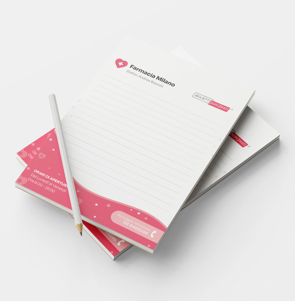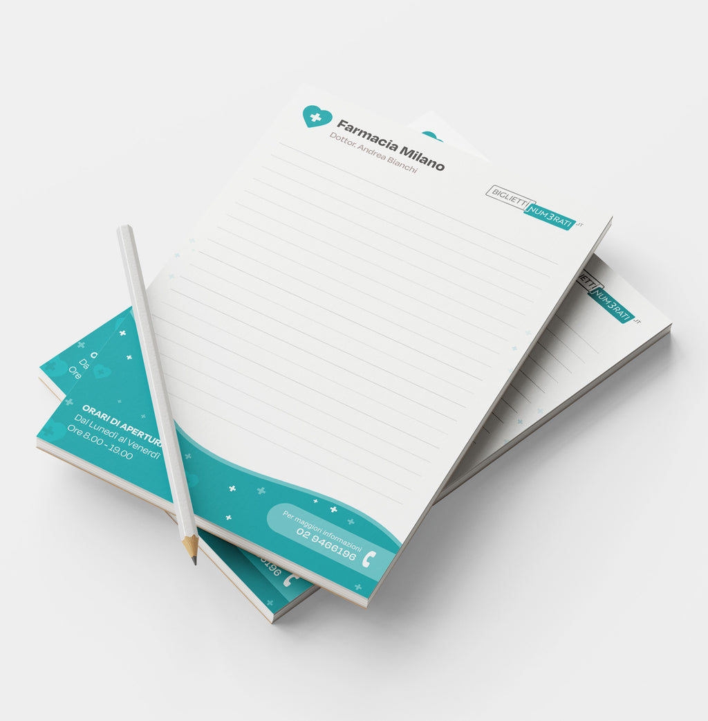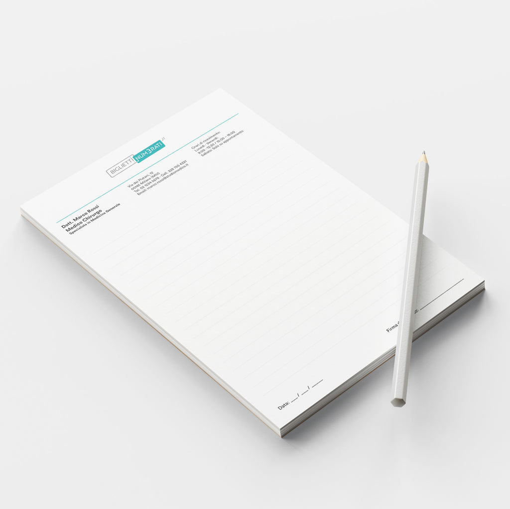 Ricettari medici personalizzati, pratici e professionali per studi medici, ambulatori, farmacie e veterinari. Stampa digitale nitida, blocchi incollati in testa con retro rigido, pronti all’uso.